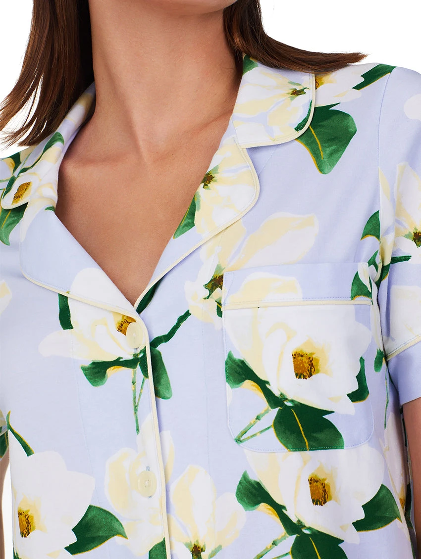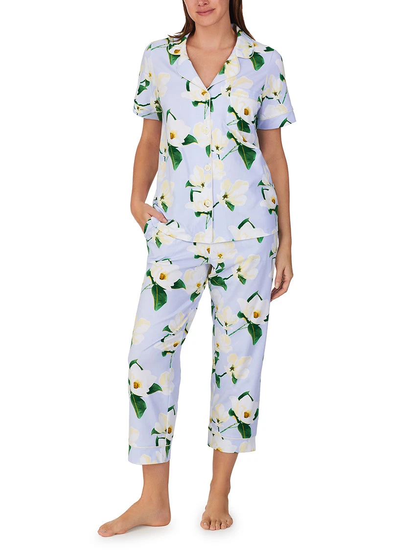 Sleep in style in the gorgeous new Crop Pj Set from Bed Head. A button up top with contrast knit piping around the collar and centre front, chest pockets, and pants with a fully elasticized waistband. Talk about comfort!