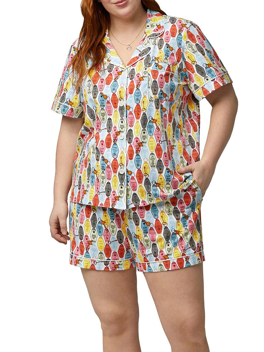 End your night in this comfortable, breathable PJ set from Bed Head. This set is a timelessly classic button front with a funky retro key chain print and contrast piping. Take your summer lounging to the next level with this luxurious organic cotton set!
