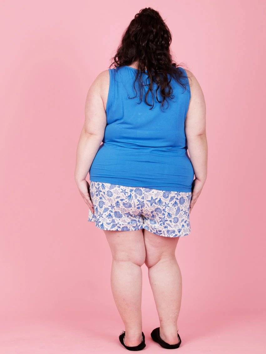 - Elastic waist shorts with blue starfishes, shells, and coral reefs print