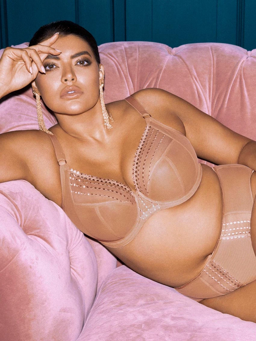 Matilda is a classic Elomi style that provides the support we all know and love, with an added twist of mesh material throughout to elevate it’s overall look and feel. This plunge style underwire bra features embroidery along sheer top panels of the cups and silvertone metal rings at base of straps for added luxury.