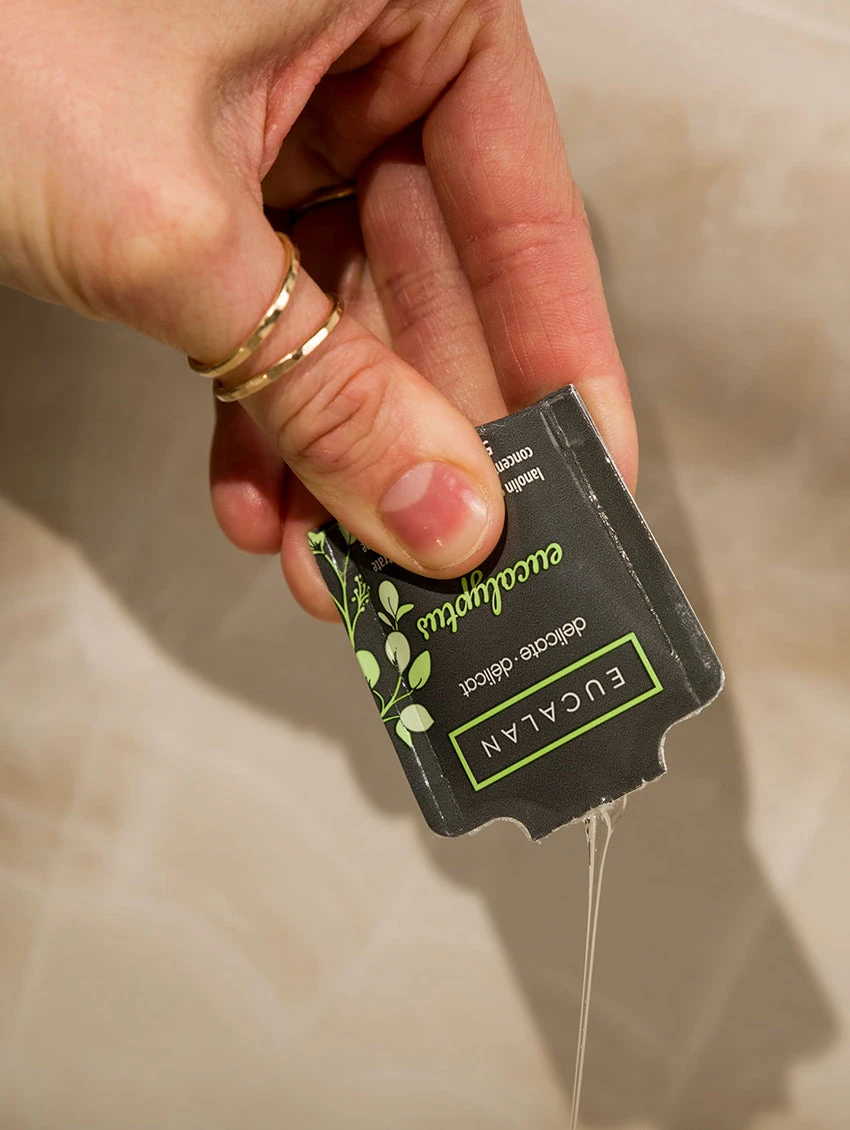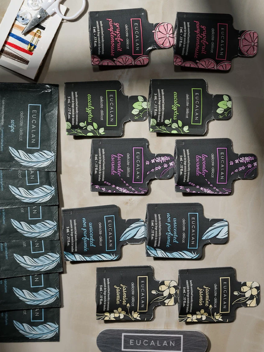 This is the perfect Getaway Pack for on-the-go delicate wash and repair. Eucalan is a natural, non-toxic, and biodegradable wash formula that is gentle on fabrics and perfect for sensitive skin. With a no-rinse formula that takes a step out of your wash routine! This convenient travel pack includes ten 5 ml wash packets, 6 stain treating wipes, a mini sewing kit, and a nail file, all in a resealable toiletries bag.