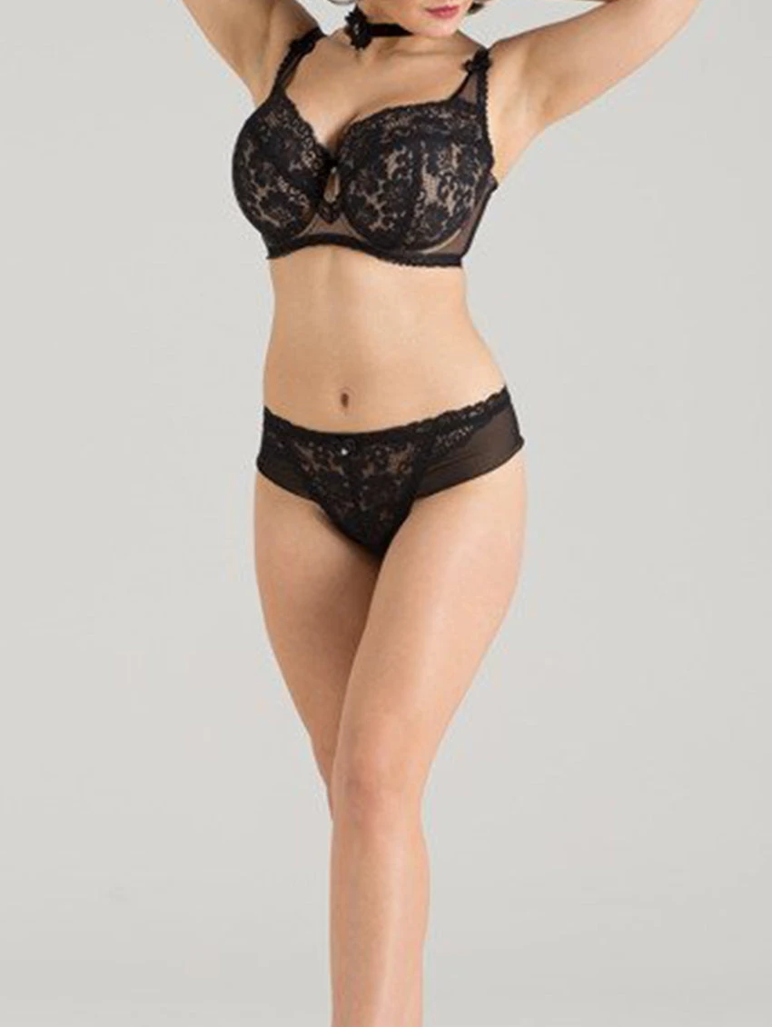 Ewa Michalak’s Yennifer line showcases classic black lace over nude tones with a sexy feminine edge. This thong has a cheeky Brazilian style cut in the back, meant to give a lifted look. This panty is the perfect match to the Yennifer bra.