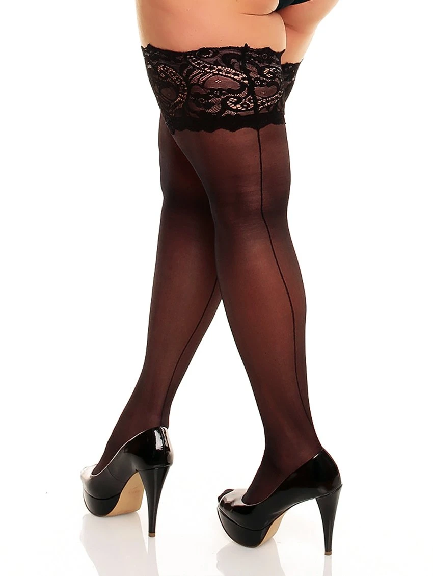 This style is transparent, with a denier score of 20 and luxurious lace topped thigh highs with a sticky stay-put silicone lining. These stockings are very stretchy and are made especially for curvy thighs.