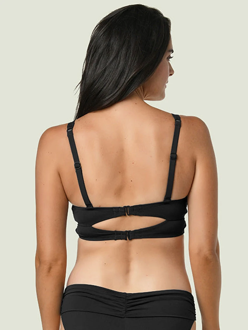 The Sophia Bikini Top features a surplice front with underwire and removeable cups for a supportive, flattering fit. The over the shoulder straps are adjustable with 2 back closures. Mix and match with endless bottoms as this is sure to become your go to black bikini.