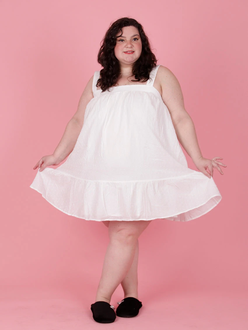 Feel crisp and fresh in the Kilo Brava The Cotton Mini Slip. Featuring fresh white cotton with raised texture, a flared and floaty hemline, and a square neckline. This slip is a great summer night dress or perfect for running through the flower fields.