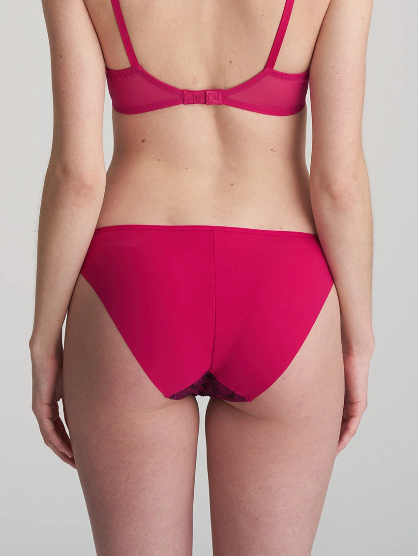 Elegant Rio briefs with striped fabric at the front, sheer lace at the hips, and opaque fabric at the back.