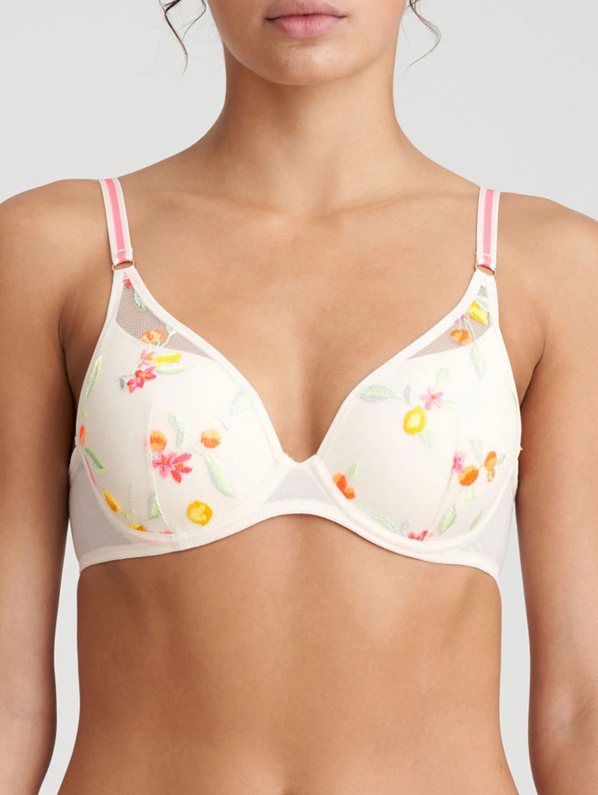 Are you looking for a preformed bra with a fresh, summery look? Then this padded bra with colorful embroidery is for you. The sleek trim on the cups contrasts beautifully with the opulent embroidery.