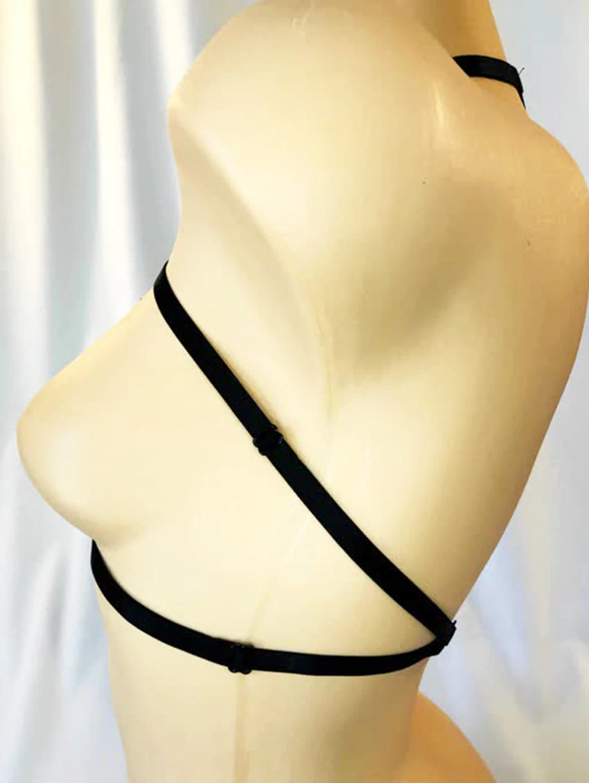 The “Hedra” harness accentuates all the best bits with a bold formation of straps! A vertical strap detail on the front adjoins multiple symmetrical straps on the upper chest and connect to bands emphasizing the breast area. This harness wears best with a strapless bra, but looks simply sexy worn on its own.