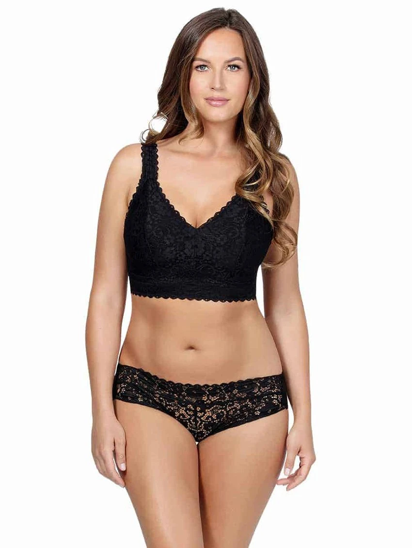 Supportive, wire-free cups and a structured band create the perfect lounge bra in pretty all-over lace. A j-hook easily converts the wide-set straps to a criss-cross style for maximum versatility. Provides comfortable support for relaxing and sleeping.