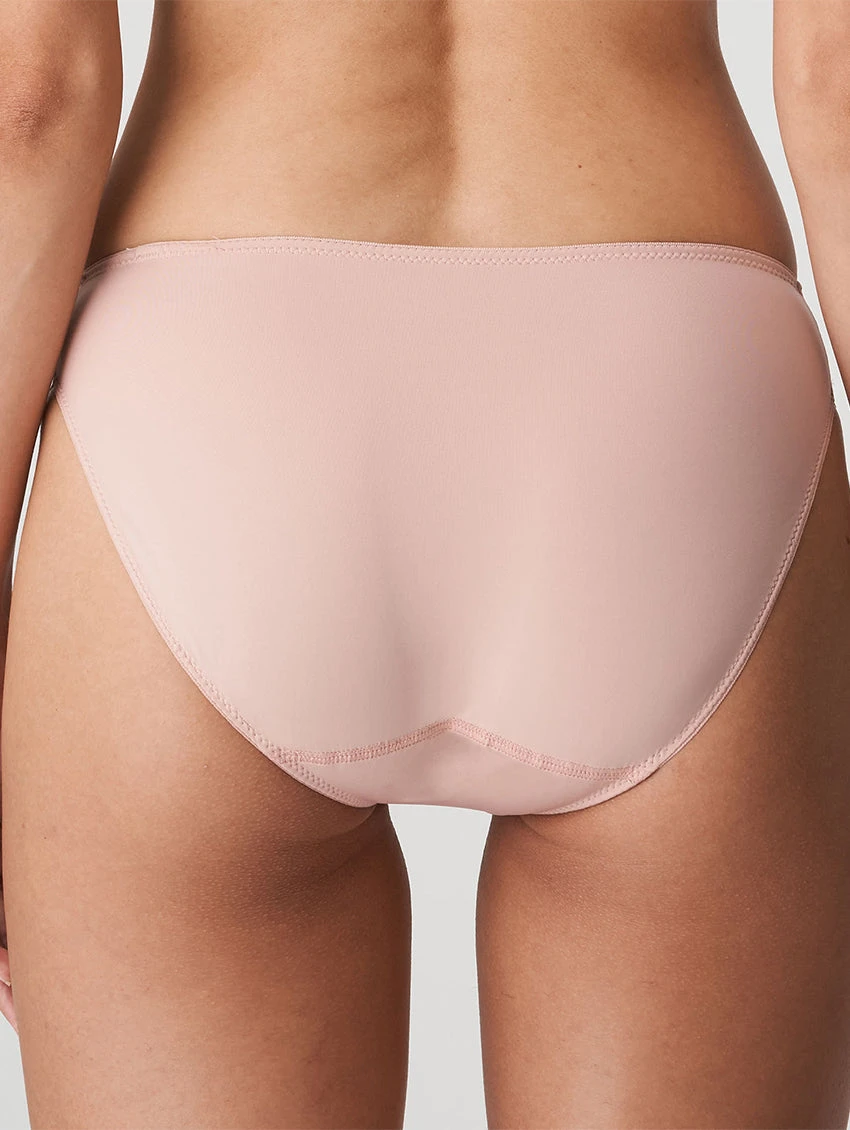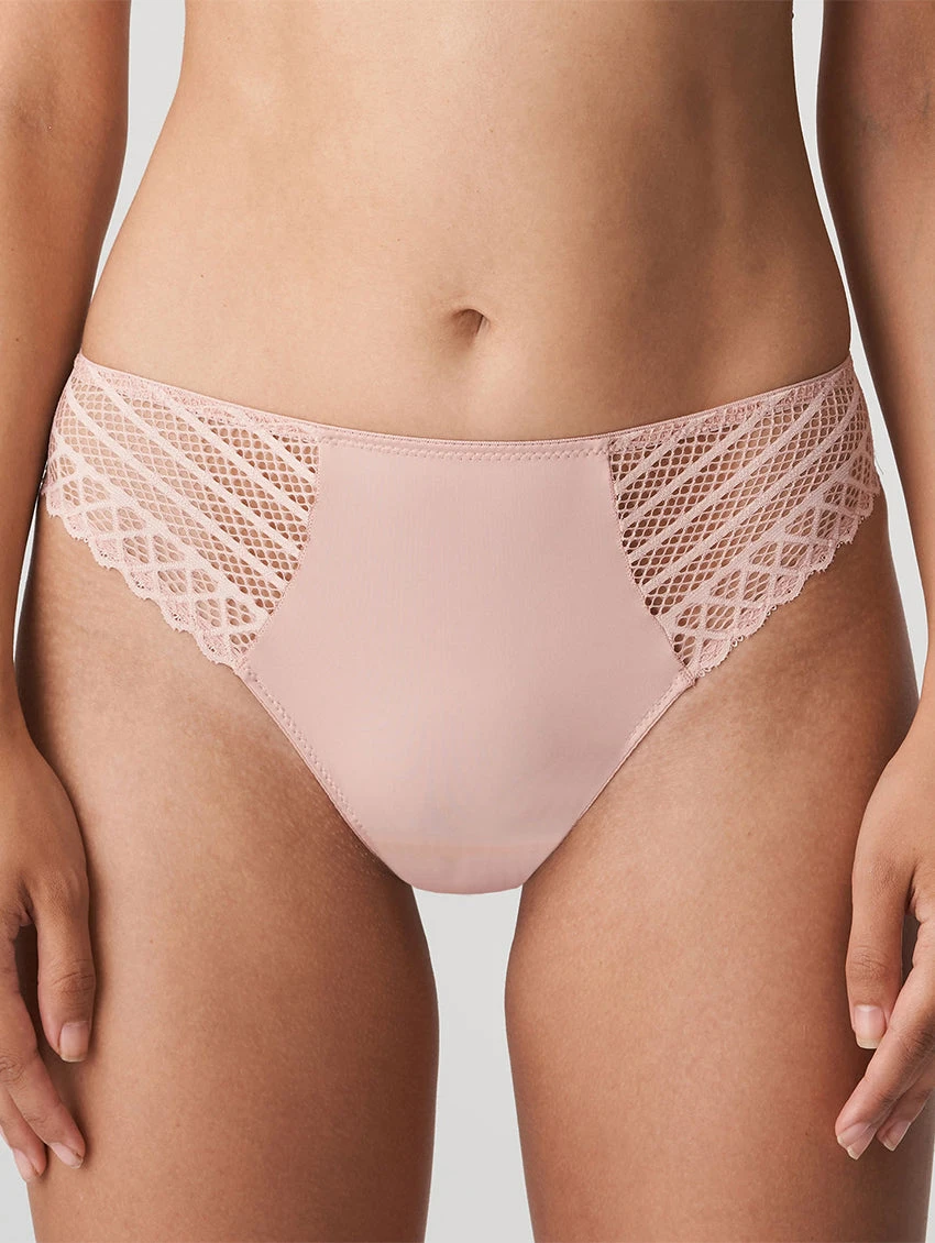 Stylish Rio briefs in a plain opaque fabric, adorned with geometric lace. The higher cut of these Rio briefs creates an elegant silhouette. The Powder Rose hue looks incredible under light summer outfits.