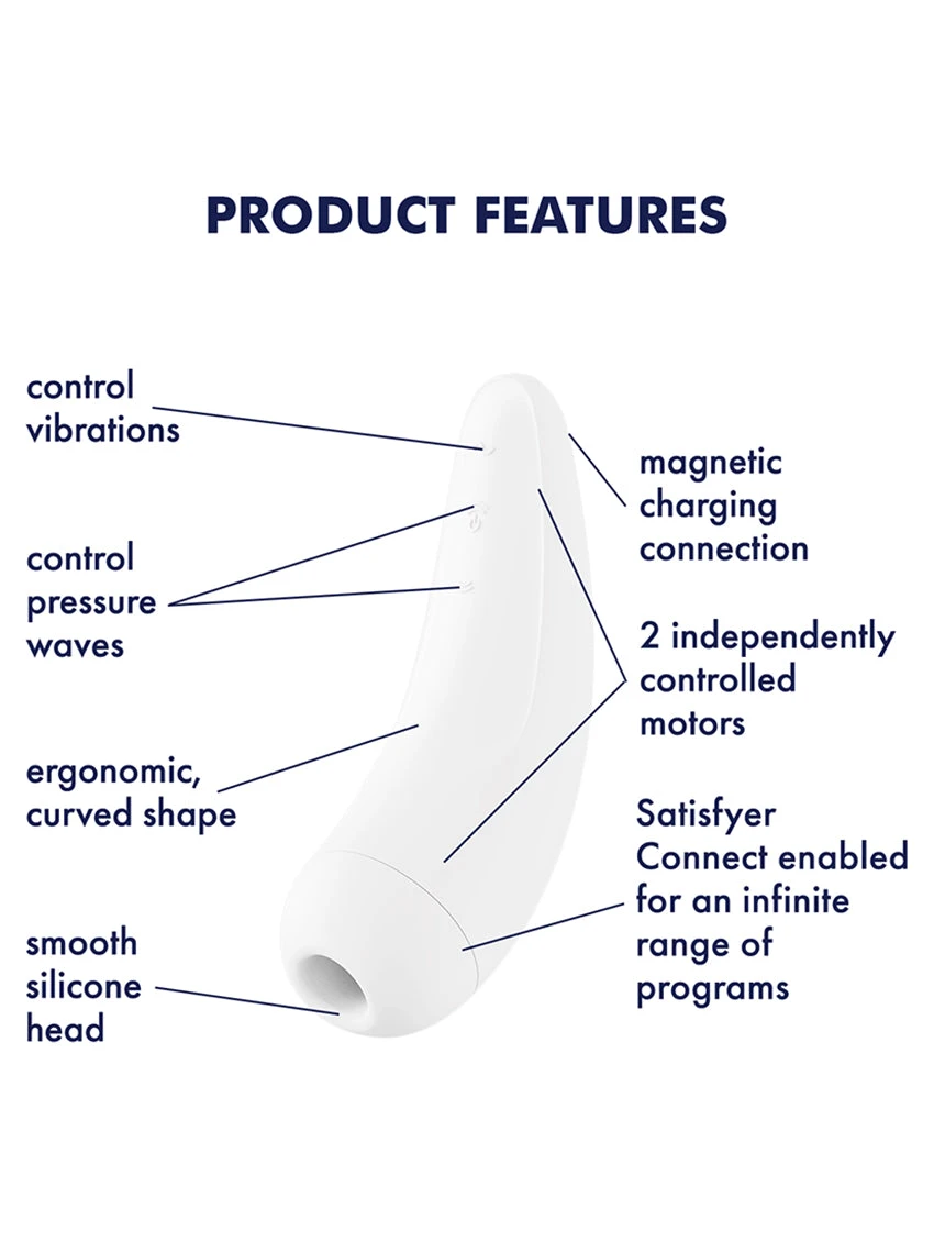 The Satisfyer Curvy 2+ is a pressure wave vibrator that gently surrounds your clitoris with its soft silicone head and catapults you to breathtaking climaxes with no-contact pressure wave stimulation and luscious vibrations. Choose between the exciting intensity levels of the pressure waves and combine them with the vibration programs – it’s so easy to let this pleasure-giver flood you with waves of excitement. Do you like to enjoy your sexual wellness in the shower or in a soothing foam bath? Perfect! The Curvy 2+ is waterproof (IPX7) and can come along with you on your little adventure. If it loses power, you can recharge the lithium-ion batteries in an easy and environmentally friendly way with the included USB magnetic charging cable.